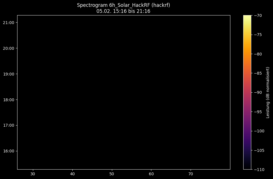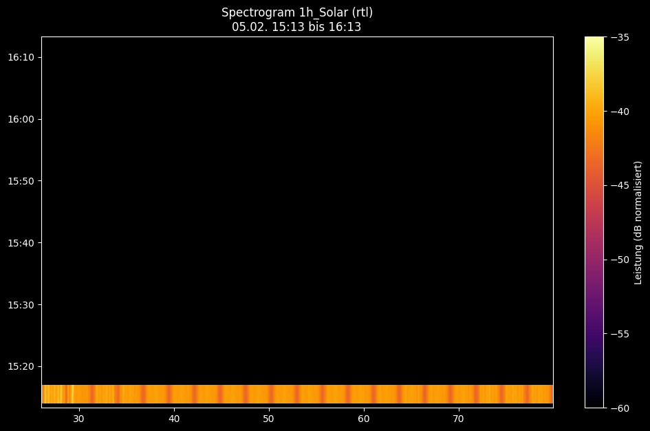 Beobachtung: Die markante Linie bei 58 MHz zeigt, dass interne Störsignale die schwachen atmosphärischen Signale komplett überlagern. Ein Tag-Nacht-Zyklus ist in der Heatmap nicht erkennbar.